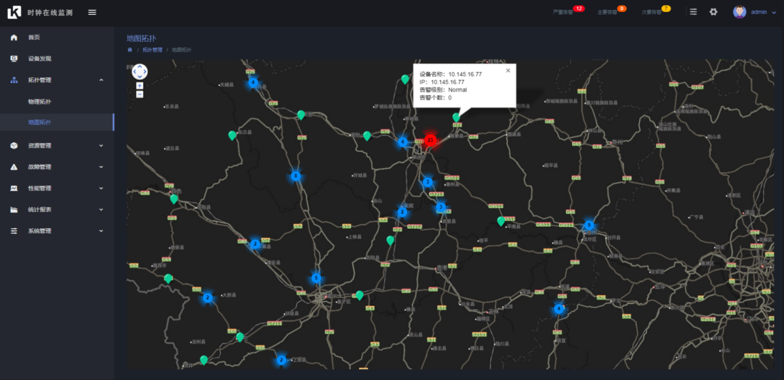 拓?fù)涔芾恚?br/>支持物理拓?fù)浜偷貓D拓?fù)洌負(fù)鋱D支持放大、縮小,布局,保存,導(dǎo)入、導(dǎo)出,自動(dòng)識(shí)別設(shè)備,自動(dòng)繪制網(wǎng)絡(luò)拓?fù)鋱D,拓?fù)湟晥D的告警關(guān)聯(lián),設(shè)備或者鏈路上以告警顏色表示告警狀態(tài)